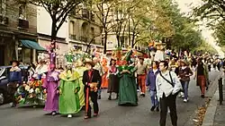 For fifteen years, the tradition of Bœuf Gras parades was nonexistent. However, in May 1951, the Paris Bi-millennium Committee revived this tradition in the slaughterhouse district of La Villette.[102] The following year, on 20 April 1952, the 19th arrondissement festival committee revived the tradition, accompanied by a hundred students from the School of Butchery. These students were attired in work attire and held up the corporation's coats of arms aloft.[103][104] For the subsequent fifty years, the festival remained dormant. The resurgence of the Paris Carnival was initiated by Basile Pachkoff and Catherine Poulain, who established the APCP (Association for the Revival of the Paris Carnival) before reemerging in September 1998 with the support of Alain Riou. The inaugural "Bœuf Gras" featured an 800-kilogram cow named Impatiente-Saint-Fargeau or Pimprenelle, rather than a bull. This bovine was not slaughtered after the festival but rather allowed to return to its pastures in Saint-Priest-les-Fougères.[105][106][107] This tradition continued until 2014, with four cows participating in the event, until its final recorded appearance in the context of the Paris Carnival.
