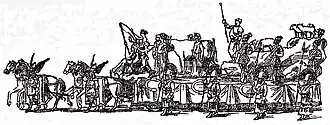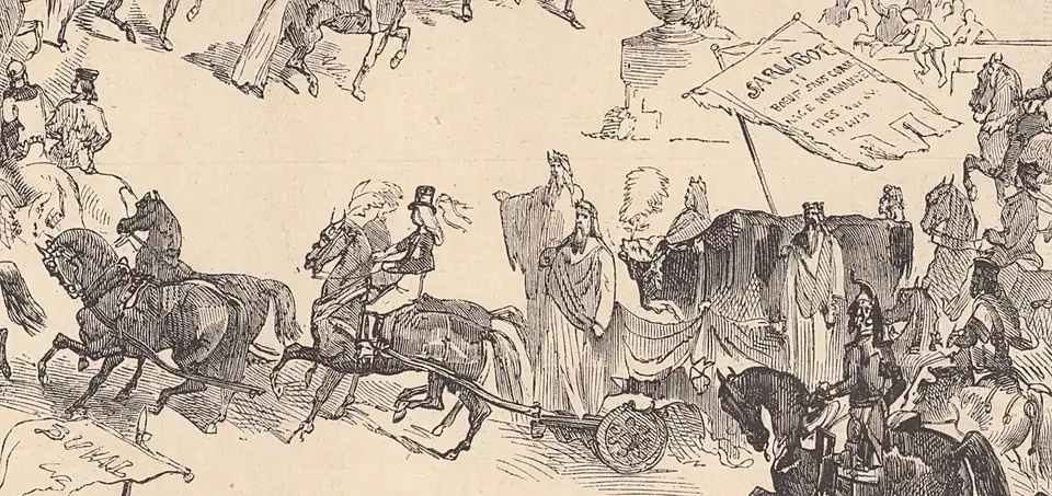 During the First Empire, for example, in February 1813, the Child dressed as Cupid was occasionally replaced by the god Mars.[21] Seven years later, Louvel attended the Fat Ox parade before fatally stabbing the Duke of Berry,[22] and street festivities were subsequently banned by Police Prefect Jules Anglès.[23] Printed programs, titled Order and Procession of the Fat Ox and decorated with engravings, were regularly distributed until the end of the Second Empire.[21][N 1][24] On 14 February 1831, clashes occurred on the same day as the Fat Ox parade. Informed of the unrest, the Foreign Minister reportedly left the Legislative Body to go to his residence, where the parade was set to pass, announcing, "I'm going to see the masks."The following year's parade, initially uncertain, was eventually held under heavy police supervision.[25] In 1846, the organizers of the parade proposed a novel innovation: the Fat Ox would be placed on a float pulled by six horses. The vehicle was tested with 258 paving stones weighing six tons—three times the ox's weight—but it broke down. As a result, Dagobert paraded on foot.[21]