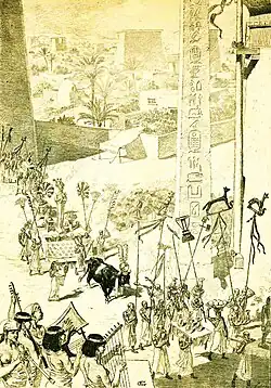 Some explanations claim that the event is a remnant of an ancient pagan ritual. In a 1739 issue of Mercure de France describing the Parade of the Fat Ox, it states: "This very old custom appears to be a remnant of certain pagan festivals, particularly sacrifices offered to false gods. Indeed, the butcher boys dress for this ceremony much like the slaves of sacrificers; the Fat Ox is adorned in the same manner as those sacrificed as victims, and the butchers carry instruments similar to those used in sacrifices."[5] In a 1783 issue of Correspondance Secrète, the festival reminded a spectator of "the Bacchanalia and the mysteries of the Egyptians."[6] In the 1805 program, the poet, songwriter, playwright, and satirist Antoine-Pierre-Augustin de Piis compared it to a "procession of the Apis bull."[N 1] This interpretation was later echoed by Louis-Charles Bizet[7] and Théophile Gautier in 1847,[8] and by Léo Delibes, who composed music in his youth for a comic text illustrating the ancient festival. This work gained some fame and was sung in 1891 at the Théâtre des Bouffes-Parisiens by Désiré and Léonce:[9]