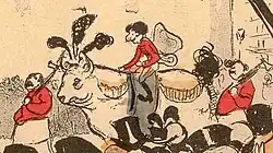 In 1783, the animal, adorned with floral embellishments on its horns, was permitted to succumb to weakness to avert potential accidents. It was led by a group of butcher boys attired in Turkish garb and mounted on horseback, marching to the melody of wind instruments performing the composition Malbrough s'en va-t-en guerre.[6] However, on Sunday, 10 February 1812, in the Place du Théâtre-des-Italiens, the Parisian Bœuf Gras, or bull, dropped the child it was carrying, ran off, and knocked over several people, and was only caught with great difficulty.[126] The following year, the child dressed as Cupid was replaced by an actor portraying the god Mars.[21] This innovation was not adopted thereafter. In 1817, an American traveler, marveling at the Parisian carnival, noted the presence of "a well-fed little Cupid" on the back of the animal.[127] In 1821, the Journal des débats, describing the arrival of the Bœuf Gras parade at the Tuileries Palace, noted that "the child who is usually mounted on the ox was carried by a man. The colossal size of the animal rendered its gait unstable, and the child would have been at risk of falling from it."[128] However, according to a 1903 newspaper article, the 1821 Bœuf Gras had eliminated the palanquin carrying the child representing Love for two consecutive days. From that point, it was decided that the ox would no longer serve as a mount for anyone, and the son of Venus later took his place in a float.[126][2][129][20] Edmond Auguste Texier hypothesizes that in bygone eras, the ox was believed to bear a child adorned not with the image of Love, but rather with that of Horus or Mithras.[10]