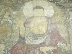 As it stands today, the wall painting measures 751.8 cm in height and 1511.3 cm in length. It is notable for its high level of detail.[1] The painting features seated Bhaisajyaguru Buddha in an imagined heaven, surrounded by Bodhisattvas and gods. Usually, Bhaisajyaguru Buddha is depicted as an Indian figure. But in this Paradise of Bhaisajyaguru painting, all the figures are depicted with Chinese dresses and robes. Bhaisajyaguru Buddha is wearing a red robe. Buddha is flanked by two seated Bodhisattvas: Avalokitesvara and Cintamanicakra. Another four secondary Bodhisattva figures can be seen in the mural.[2] The Twelve Heavenly Generals, six at each side in the painting symbolizes the Buddha's vow to help others.[1] This painting was formerly confused as the Assembly of Śākyamuni Buddha.[2]