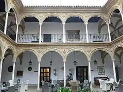 The central patio has a complete twin-tiered arcade supported by slender, Nasrid-inspired marble Doric columns.[10] The arches were described by the historian (and in the 1980s, mayor of Úbeda) Arsenio Moreno Mendoza (1953—2021) as an architectural feature of "incredible grace and elegance".[1] Each of the spandrels between the arches is adorned with a small mirror. They are said to be typical of the architectural style of Andrés de Vandelvira.[10] Most of the major rooms of the palace were reached from the patio galleries.