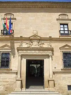 The Úbeda Parador's original building was built of stone in a classical Renaissance style, typical of Úbeda and the neighbouring town of Baeza.[6] It had an almost rectangular layout on two floors surrounding a spacious central courtyard.[7] The southern frontal façade onto the Plaza Vázquez de Molina is simple and restrained[8] with a marked horizontal nature and symmetry. It rests on a prominent base with small windows to the sub-basement and iron rings for tethering horses. The main façade displays two series of six window openings, crowned on the lower floor with triangular pediments and on the upper floor with mannerist features. The principal door is almost in the centre (being slightly offset towards the west), the steps up to the level of the central patio framed by Doric columns on which two female figures with wings support a coat of arms.[7] Two further windows at each corner of the upper floor are designed in a detail typical of the Hispanic-Renaissance period in Úbeda, their balconies each supported in the centre by a white marble column. They opened from the two finest rooms in the palace. The façade is crowned by a pronounced corbelled cornice with a frieze of large egg-and-dart ornamentation.[1][9]