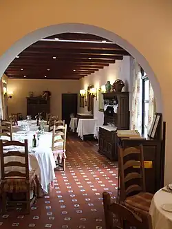 Sánchez and Vicuña enlarged the guest lounges at the expense of the existing dining room and kitchen. They placed the new kitchens in an independent pavilion and located the guest dining room and the function room - named the Salón del Deán Ortega - in what had been the staff quarters and the garage. Above this, ten double bedrooms were built, replacing chauffeurs' rooms and staff bedrooms.[23] In the old part, three guest rooms were remodelled and upgraded, together with all the bathrooms. The main garden was remodelled to act as an outdoor extension of the new lounges. At the same time, the electrical, plumbing, heating and hot water installations were completely renewed, air conditioning was installed throughout and a lift was installed. There was also radical restoration of the roof, the stonework inside and out, the paving and woodwork and the panelled ceilings while in the main courtyard the columns and glassed-in archways on the upper floor were repaired while concealed guttering was installed.[1]