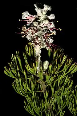 The shrub grows up to 1.0 m (3.3 ft) tall and flowers mainly from June to November. Fire destroys the plant but the seeds survive. The plant is bisexual and pollinated by insects. The fruit ripens two months after the plant has flowered and the seeds fall to the ground where they are spread by ants.