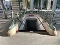 Three of the entrances took the form of free-standing pavilions or small stations,[5] including waiting rooms: one at Bastille and two on Avenue de Wagram at Étoile. These were in a style influenced by Japanese pagodas. At Étoile Guimard provided exterior doors for elevators, although the elevators were not built.[10] Eight simpler but still elaborate structures, labeled "Édicule B" by Guimard, were installed at the termini of Line 1 as originally opened and at two other major stations. These consisted of three-sided glass-roofed structures enclosing the stairway, with a projecting canopy.[10][11][12] A variation on this format, "Édicule A", lacked the canopy and was erected at two stations, Saint-Paul and Reuilly – Diderot.[10] These édicule types of entrance, which have come to be called libellules because they resemble dragonflies, in some cases had decorated wall panels surfaced in reconstituted lava.[11] The great majority of the entrances built (154) were unroofed enclosures, dubbed an entourage. A transitional form between the entourage and the édicule, railings with a roof and canopy, was used for one entrance at the Gare de Lyon métro station.[13]