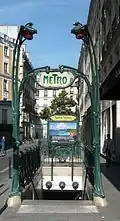The initial network of the Paris Métropolitain (soon commonly abbreviated to "Métro") was planned and built at one time in order to minimize disruption to the city from on-going construction and to open Line 1 and two branches in time for the Exposition Universelle in 1900. A design competition was held for the above-ground components, to alleviate the public's fear that they would mar the cityscape with an industrial appearance. The new entrances were stipulated to be "as elegant as possible but above all very light, prioritising iron, glass and ceramic".[1] However, the submitted entries were all too bulky for many of the sidewalk sites.[2][3] Adrien Bénard, the financier whose bank was underwriting the construction, liked the new Art Nouveau style and therefore instead persuaded the Compagnie du chemin de fer métropolitain de Paris (CMP) to appoint the still young Hector Guimard to design the entrances to the underground stations,[4][5] while the elevated stations were designed by Jean-Camille Formigé, chief architect of the City of Paris.[6]