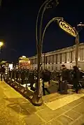 - Entourage Guimard: Square-Victoria-OACI station on the Montreal Metro in Canada has a genuine Guimard entrance made from parts of demolished Paris entrances (with map holder and "Métropolitain" sign and holder reproduced from the original molds). It was installed in 1967.[28] During restoration in 2001–2002, it was found to have the last examples of the original glass light globes, which in Paris had been replaced with plastic for safety; one was returned to the RATP and the other placed on display in the Montreal Museum of Fine Arts.[29]