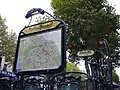 Rather than stone, Guimard used cast iron set in concrete both to reduce costs and to suit the sinuous Art Nouveau forms;[3][6] they were painted in a green emulating weathered brass.[7] (For a renovation that began in 1999, the RATP, the Paris transportation authority, restored the entrances to two slightly different shades: at sites with a lot of vegetation, vert wagon ('train-car green'), the dark green used for Parisian public works at the turn of the 20th century, and at fully urban sites, a slightly bluer shade, vert allemand ('German green').[8]) He designed standardized components, including railing cartouches incorporating the letter "M" and signs in his own distinctive lettering reading "Métropolitain" or, at narrow entrances, "Métro"; later the use of the lettering was extended to a holder for a system map and for advertising (porte-plan) with the station name above. In addition to speed (the first set of entrances were installed within six months of their design)[9] and relatively low cost in manufacture and adaptation to different sizes and locations of entrances, all of this gave the system a stylistic identity.[6][10]