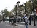 However, critics and many of the public were hostile to the libellules in particular, and criticized the green as "German" and the lettering as "un-French"[6] and, according to critic André Hallays in Le Temps, "confus[ing to] little children who are trying to learn their letters and ... stupefy[ing to] foreigners".[21] On the Champs-Élysées, for example at Marbeuf (now part of Franklin D. Roosevelt), simple stone walls with discreet carved signage were used instead,[10] and a plain design was also used at Bourse.[22][23] Unhappiness with Guimard's 1904 design for the Opéra station,[24] described in Le Figaro as having "contorted ramps" and "enormous frog-eye lamps",[25] and increasing costs led to the CMP severing its relationship with him.[5][22] The entrance at Opéra was instead designed by Joseph-Marie Cassien-Bernard, in classical marble.[22][25] The CMP bought Guimard's molds and rights[22] and a total of 141 of his entrances were ultimately produced, the last in 1913.[20]