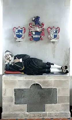 The heraldic achievement above the effigy shows arms: Azure, five fusils fesswise argent a canton of the last; crest: A demi-lion rampant bezantee azure armed and langued gules holding between its paws a fusil argent.