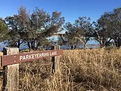 Parkeyerring Lake is an ephemeral salt lake in the Wheatbelt region of Western Australia, approximately 7 km (4.3 mi) south of the town of Wagin and about 235 km (146 mi) southeast of Perth. Much of the lake is surrounded by the 991 ha (2,450-acre) Parkeyerring Nature Reserve,[2] which was gazetted in 1905[3] and expanded in 1957.[2]