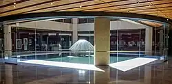 Behind the entrance building is the Jubilee Room, used for committee meetings and public functions. In this area, which is open to the public, there is also the Fountain Court, an exhibition venue containing a fountain by Robert Woodward. Beneath the Fountain Court is a 166-seat theatrette and above it a roof garden sometimes used for functions. Together with a small post office, these 1970s features form a "square doughnut"-shaped building linking the streetfront buildings with a 12-storey block at the rear. This block, with views over the Domain contains offices for members and other staff and meetings rooms, as well as dining facilities, a fitness area and car parking and service areas. The building has a power co-generation unit that serves Sydney Hospital and the State Library of New South Wales as well as Parliament House.[5]