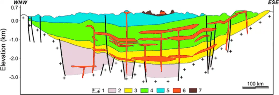 Schematic cross section of the Parnaíba Basin 1- Precambrian basement, 2- Pre-silurian rift sequence, 3- Silurian, 4- Devonian-Carboniferous, 5- Permian-Triassic, 6- Magmatic rocks (basalt/diabase), 7- Cenozoic to recent sedimentary cover [2]