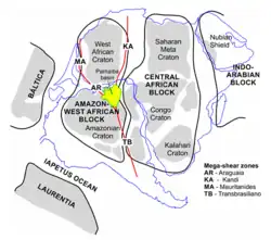 It was regarded as one of the continental fragments inherited by the South American platform after the dispersal of the Rodinia supercontinent to form the Gondwana supercontinent.[8] The São Francisco Craton and São Luis Craton existed before the opening of the Atlantic Ocean in Mesozoic times, were part of larger cratonic landmasses, and probably surrounded a central Parnaíba block presently concealed under the basin's sediments.[9] To the west, the Araguaia suture zone represents the final Neoproterozoic collision between the Amazonian craton and the Parnaíba block and, to the east, the Transbrasiliano Lineament marks the border with the Borborema Province.[8][10]