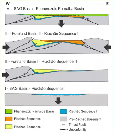 The Phanerozic Parnaíba basin sits on top of the remnant Riachão basin sequences, and shows no signs of deformation from thrust faulting. An intense erosional event took place after the deposition of the Riachão basin sequences that ultimately created a profound pre-Silurian unconformity. The subsidence and deposition of the Parnaíba basin sediments occurred after this event and have little to do with the previous development and deformation of the Riachão basin.[11]