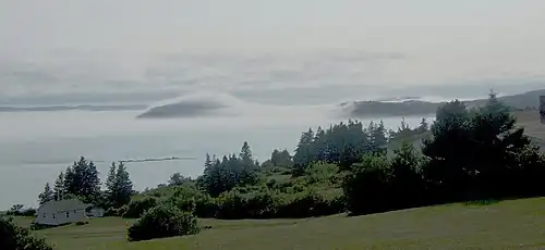 Partridge Island, shrouded in fog, viewed from the east across the mouth of Parrsboro Harbour from Greenhill
