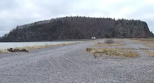 Partridge Island is a significant historical, cultural and geological site located near the mouth of Parrsboro Harbour and the town of Parrsboro on the Minas Basin, in Cumberland County, Nova Scotia, Canada. It attracts many visitors including sightseers, swimmers, photographers, hikers and amateur geologists.[1] Partridge Island is actually a peninsula that is connected to the mainland by a sandbar isthmus.[2] According to local legend, the isthmus was created during the Saxby Gale of 1869.[3][4] The hiking trail to the top of the island affords scenic views of key landforms on the Minas Basin including Cape Blomidon, Cape Split and Cape Sharp.[5] The nearby Ottawa House By-the-Sea Museum contains artifacts and exhibits illustrating the history of the former village at Partridge Island, which dates from the 1770s.[6] Partridge Island is a favourite hunting ground for rockhounds because its ancient sandstone and basalt cliffs are steadily eroded by the fast-moving currents of the world's highest tides. Rocks and debris worn away from its cliffs are dragged down the beach making it possible to find gemstones, exotic-looking zeolite minerals and fossils.[7] Fossil hunters are warned, however, that although one or two loose specimens may be collected, Nova Scotia law requires that they be sent or taken to a museum for further study, and no fossils may be excavated from bedrock without a permit.[8]