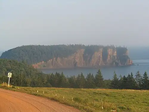 The three kilometre (1.9 mile) round-trip, hiking trail on Partridge Island climbs quickly to a height of about 61 metres (200 feet) above sea level, but there are four benches to rest on.[26] There is a lookoff at the top of the trail from which a viewing platform offers vistas of more than 60 kilometres (37 miles) of the coastline of the Upper Minas Basin.[20] Prominent features include Cape Blomidon, Cape Split, Cape Sharp, Cape d'Or, and Cobequid Bay. At dusk many lighthouses can be seen on the coasts surrounding Partridge Island. Visitors are advised to stay on the trail and to keep away from the edge of the cliffs, which could give way without warning.[5]