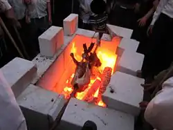 The slaughtering took place in the courtyard of the Temple at Jerusalem. The slaughter could be performed by a layman, although the rituals dealing with the blood and fat had to be carried out by a priest.[2][3] The blood had to be collected by a priest, and rows of priests with gold or silver cups in their hands stood in line from the Temple court to the altar, where the blood was sprinkled. These cups were rounded on the bottom so that they could not be set down, because the blood might thus coagulate. The priest who caught the blood as it dropped from the sacrificial animal then handed the cup to the priest next to him, receiving from him an empty one, and the full cup was passed along the line until it reached the last priest, who sprinkled its contents on the altar. The lamb was then hung upon special hooks or sticks and skinned; but if the eve of the Passover fell on a Sabbath, the skin was removed down to the breast only. The abdomen was then cut open, and the fatty portions intended for the altar were taken out, placed in a vessel, salted, and offered by the priest on the altar, while the remaining entrails likewise were taken out and cleansed.[2]