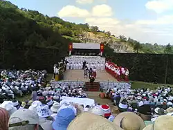 The pastoral is a traditional kind of play from the Basque Country held in the region of Soule (Zuberoa in Basque), France. It features a set range of characters and acts repeated on all pieces. This kind of theatre represents a dualism between the wicked (dressed in red, called türkak or satanak, literally 'the Turkish' or 'the Demons') and the righteous (blue outfit, called kiristiak, 'the Christians'). On every new creation, a different story is staged, where verses are recited in Zuberoan Basque by the players following a pre-established stance and steps on the scene. Singing and dance play an important role too, the performance actually culminating with a choral staging where the collective spirit is voiced. The development of the story is supported by a brass-band and/or the xirula and the psalterium (ttun-ttun).