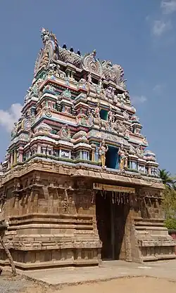 This temple was first built by Kochchenganan.[5] The temple is situated in the north east of the village. The entrance is facing east. It has three tier rajagopura, the biggest in these seven temples. On either side of the entrance sculptures of Thanjavur Nayak style are found. After crossing over the 7 m x 10 m entrance of the gopura, one can enter into the temple premises. It has two structures one for presiding deity and another for the consort. This temple has one big outer prakara. A bali pita and rishaba are found in the outer prakara. In the prakara, vilva tree, shrines of Dakshinamurthy, Jestadevi, Nagavalli, temple well, Sanisvara and Bhairava are found. In the north west of the outer prakara two shrines are found. In one shrine naga devata is set up. Next to this shrine, Gajalakshmi shrine is found. Through the steps found in southern side, the shrine of the presiding deity could be reached. The shrine is 5 m above the ground floor. Upper floor has two sections. In this floor shrines of Uchista Vinayaka, presiding deity and Goddess are found. The main shrines are found on the upper floor, at a height of 3 m. After going through the steps Ganesha shrine could be reached.[1]