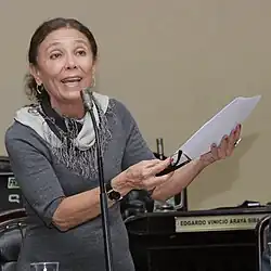Mora is a sociologist and professor of general studies at the University of Costa Rica. She was a member of the People's Vanguard, Democratic Force, and People's Party, and participated in social struggles against ALCOA, against the Energy Combo Bill, and against the free trade agreement with the United States. She was a founding member of the Broad Front alongside her husband, and was its representative before the Foro de São Paulo as a member of its Political Commission and the executive committee.[2][3] She was elected deputy for the party in the 2014 general election.[4]