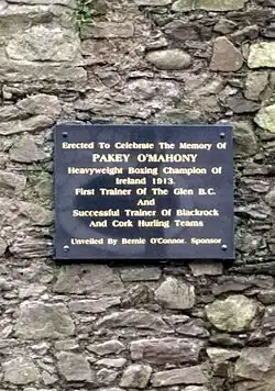 Patrick 'Pakey' O'Mahony (1880–1968) alias "Packey Mahoney", was an Irish boxer and hurling trainer. He won the Irish heavyweight championship in 1912. His professional boxing career saw him win his first fourteen fights; he lost (and retired after) his fifteenth fight, a contest with Bombardier Billy Wells on 30 June 1913. He was the first trainer of the Glen Boxing Club.
