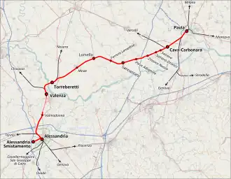 The line was opened in 1862. Between Torreberetti and Alessandria it uses the Novara–Alessandria railway, opened in 1854.[4]