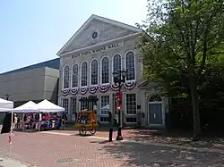 The East India Marine Hall was built in 1824–25 for the East India Marine Society to house its collection. Design of the building has most recently been ascribed to Thomas Waldron Sumner. It stands on the south side of Essex Street and is now integrated into the body of the Peabody Essex Museum. As built, it was a two-story structure, faced in granite on the front (Essex Street facade), and brick on the sides, measuring about 45 by 100 feet (14 m × 30 m). The main facade has been preserved; it has six rectangular bays on the main floor and seven tall round-arch windows on the second level. The gable pediment is fully enclosed, with a round window in the tympanum.[14]