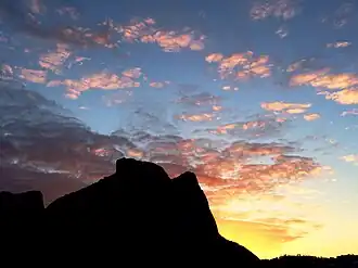 Differential weathering incised the northern side of the mountain, producing cavities underneath the granite dome.[2][10] The abrupt dome itself is the result of the more durable granite having resisted the aforementioned weathering more so than the softer gneiss.[2] Furthermore, erosion has worn etches into the mountain's sides.[11][12][13]