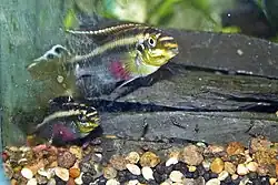 P. sacrimontis was first described in the monthly journal of the German Cichlid Association (DCG-Info) by Joachim Paulo in 1977 as part of an article on Pelvicachromis kribensis.[4] As this description referenced an iconotype the taxon lacked a type specimen. Although this publication did not present a complete diagnosis according to Lamboj (1999) it constituted a valid description following the applicable articles of the International Code of Zoological Nomenclature. For a long time the validity of this taxon was either not recognized or the name was defined as an “unjustified substitute“ for Pelvicachromis camerunensis, a name that appeared in Thys van den Audenaerde (1968) but was a commercial name that was not available (Daget et al. 1991). The use of Pelvicachromis camerunensis is doubly confusing given that this species is not found in Cameroon. Nevertheless, specimens of this species were mentioned in Thys van den Audenaerde (1968) as P. pulcher "form B" or P. sp. aff. pulcher and recognized as being a distinct species, different from P. pulcher mainly in colouration patterns.[3] P. sacrimontis was redescribed by Anton Lamboj and Christopher Pichler in their 2012 paper with a neotype and paraneotypes being assigned from specimens held in The Royal Museum for Central Africa.[3]