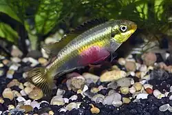 The first pelvic fin ray is always longest in males with the tip of the pelvic fin reaching the anterior base of the anal fin or beyond giving the fin a pointed appearance. The dorsal fin has a red margin followed by a white submargin and black base in the anterior parts and a greyish to clear base in the posterior parts. The caudal fin is clear to pale reddish with a red margin on the upper half followed by a white or iridescent blue part. The anal fin has a red margin on the anterior edge with the rest of fin blue/violet. Three colour morphs are distinguishable: