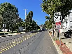 Pennsylvania Route 213 (PA 213) is a 6.95-mile-long (11.18 km) state highway in Bucks County, Pennsylvania. The route runs from PA 532 in Feasterville, which is located in Lower Southampton Township, north to U.S. Route 1 Business (US 1 Bus.) in Middletown Township, near the Oxford Valley Mall. PA 213 is signed as a north-south route but it actually travels east–west through its route, with the northern terminus being well east of the southern terminus but only slightly further north. Along the way, PA 213 passes through the borough of Langhorne and has intermediate junctions with PA 413 in Langhorne and US 1 in Middletown Township. The southernmost part of PA 213 was originally chartered as the Bridgetown and Feasterville Turnpike in 1844. In 1913, the northern portion of present-day PA 213 became a part of the route for the Lincoln Highway, being bypassed in 1923. PA 213 was designated onto its current alignment in 1928.