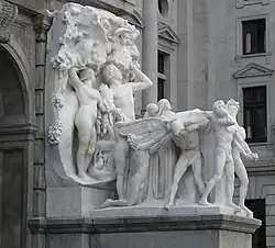 The groups were carved in marble by the Piccirilli Brothers in New York City in 1909 and 1910,[2] and shipped to France to make their public debut at the Paris Salon.