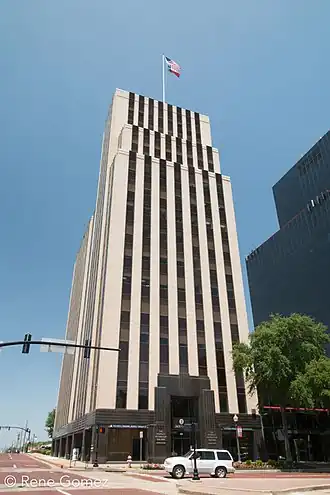 People's National Bank Building is a high-rise building in Courthouse Square, Tyler, Texas, at 102 N. College Street. It is listed on the National Register of Historic Places. The Art Deco building was designed by noted Texas architect Alfred C. Finn, who touted an extensive portfolio of steel-framed skyscrapers when the People's National Bank Building was completed in 1932. Since 2014 it has been known as the People's Petroleum Building.