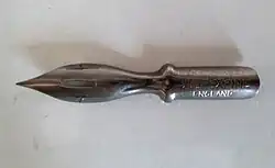 Perry & Co. produced a large variety of models for different purposes, most of them designed to produce fine lines (such as Nº 25 or 341, which is still easy to find in stores of Argentina). Other models were also popular by their names, like the "Queen Mary"[7] or the "Quill Pen" (Nº 230-231-232)[8] Perry & Co. also produced different giant-sized versions of its N°2301 Indent Pen model. Those were 5" long (see thumbnail photo).