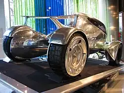 In the design of the Peugeot Moonster, the engine is located at wheel level. Its design is inspired by cars of 2020 and the early 1900s, as well as lunar rovers and dolphins, in which the rear spoiler is in the shape of a dolphin tail. The body of the Moonster is made from polished aluminum sheets, which were formed into curves, giving a chrome appearance to the car. The interior has four seats and an aircraft-like steering wheel.[2][3]