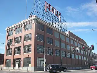 The oldest building on the site dates to 1915 and was located at the southwest corner of Grand Blvd. and Chouteau. Located at 1001 South Grand Blvd., it housed the offices for the company on four stories.[1] The red brick office building has a three-bay facade on the first story, and inside it retained its white glazed brick walls and flooring.[1] The upper floor roof line included a decorated cornice.[1] In 1916, Pevely added a brick and concrete factory building on the site, located at 3626 Chouteau Avenue.[1] The factory underwent expansions in 1943, 1945, 1975, 1985, and 1997; in addition, a garage was built south of the factory at 1101 Motard Avenue in 1928, and a smokestack on the site that dates to 1943 included glazed brick lettering that spells out Pevely.[1]