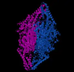 Phenylalanine ammonia lyase is composed of four identical subunits composed mainly of alpha-helices, with pairs of monomers forming a single active site.[17] Catalysis in PAL may be governed by the dipole moments of seven different alpha helices associated with the active site.[19] The active site contains the electrophilic group MIO non-covalently bonded to three helices. Leu266, Asn270, Val269, Leu215, Lys486, and Ile472 are located on the active site helices, while Phe413, Glu496, and Gln500 contribute to the stabilization of the MIO cofactor. The orientation of dipole moments generated by helices within the active site generates an electropositive region for ideal reactivity with MIO. The partially positive regions in the active site may also help stabilize the charge of a carbanion intermediate. PAL is structurally similar to the mechanistically related histidine ammonia lyase, although PAL has approximately 215 additional residues.[17]