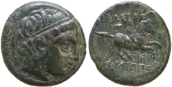 ![]() Copper coin struck sometime during Philip's reign. Obv.: head of Apollo facing right; rev.: horseback rider. | |