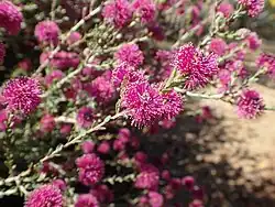 The flowers are pink to purple and are arranged in dense, roughly spherical heads about 10 millimetres (0.4 in) in diameter on the ends of branches which continue to grow after flowering. There are 5 sepals, 5 petals and 5 bundles of stamens. It can be distinguished from the other two species of Phymatocarpus by it lack of a ring of stamens - both the others have the stamens joined in a ring at their bases.[4] Flowering occurs from August to November and is followed by fruits which are woody capsules. The individual capsules are about 2.5 millimetres (0.1 in) in diameter and are arranged in clusters which are rough or lumpy on the outer surface.[1][2][3]