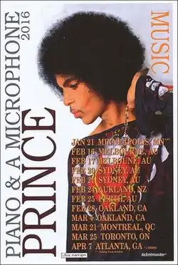 The Piano & a Microphone Tour was the final concert tour by American recording artist Prince.[1][2] In a December 2015 interview in anticipation of the tour, he said that "I'm doing it to challenge myself, I won't know what songs I'm going to do when I go on stage. I won't have to, because I won't have a band".[3] It was ultimately Prince's final tour due to his sudden death at age 57, from a fentanyl overdose on April 21, 2016, one week after the last tour date.
