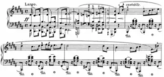 time. The Largo opens with a four-bar transition from the E-flat major of the scherzo to the key of the movement: B major. [19] Despite a thunderous introduction in dotted rhythm, the Largo is serene, almost nocturne-like.[20] Slow melody in duple metre and dotted rhythms give this movement the characteristics of a funeral march, without the expression of one.[21] Charles Rosen noted that the movement is a tribute to the Italian stage – specifically Bellini.[19] Following the first theme is the trio in the subdominant key E major,[20] with the right hand creating a three-voice structure through the use of arpeggiated figures.[22] It lasts almost three times as long as the first part and nearly four times as long as the reprise.[18] The texture of the main theme and the middle section are combined for the coda of the movement.[23]