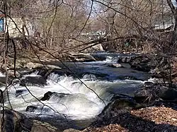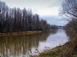 North of the border, the river crosses a series of falls and rapids) interspersed with long, slow-flowing sections, crossing Frelighsburg, Stanbridge East and Bedford before leaving the Appalachians to reach the plain of St. Lawrence Lowlands. A series of close falls are contained by five dams. Further downstream, the course of the river becomes winding, making a long detour via Notre-Dame-de-Stanbridge, then crossing the last rapids at Pike River to finish its course through swampy forests. The Pike River is a tributary of the northeast shore of Missisquoi Bay in Quebec.[3]