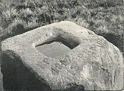 Its demolition is an act of pure vandalism, for which one can find no excuse, and for which it is difficult even to suggest a motive. It appears to have been carried out by clumsy depredators. Wedges had been inserted in the block.The wedge holes were badly made, and other marks show the unskilful use of heavy hammers. The destruction was evidently committed on the site, and the broken fragments were afterwards carried to the wet boghole, twenty yards distant, in which they were found. Unfortunately they are too numerous, there being at least fifty, for any hope to be entertained of the stone being pieced together again and replaced in its old site.[11]