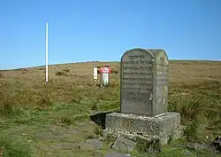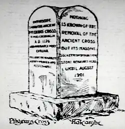 Before destruction, the ancient cross was called variously Whowell's Cross and Chatterton's Cross.[2] The Lancashire Evening Post suggested that, "The cross itself was believed to have been broken by drunken quarrymen generations before [the base stone was destroyed]".[6] What little is known of the history of the Pilgrims' Cross is inscribed on the stone monument itself which was erected on 24 May 1902 after the original socket was destroyed "by vandals" in 1901.[2][7] A letter from the Reverend Henry Dowsett to the Manchester Evening News was published on 24 August of the same year:[nb 1][8]