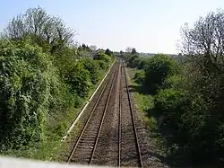 View south from road bridge over line. The heavily wooded area on the left is the site of the former station.