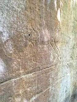 In this photo, one of the anthropomorphs along with some graffiti can be spotted.