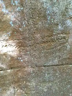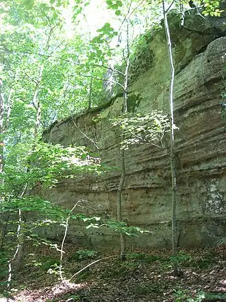 The Piney Creek South Site is a prehistoric rock art site located on the south side of Piney Creek in Piney Creek Ravine State Natural Area in Randolph County, Illinois. The site consists of two groups of petroglyphs drawn on a sandstone rockshelter. The petroglyphs most likely date from the Late Woodland period, which lasted from 450 to 900 A.D. The larger petroglyph group contains ten designs: four anthropomorphs, a quadruped resembling a deer, three crosses, and two pits. The four designs in the smaller group include two anthropomorphs, a group of pits extending from an anthropomorph's head, and a pecked area. Several of the anthropomorphs appear to have wings, two are carrying shields or rattles, one appears to have a beak, and one may have a crude penis. The site likely had spiritual significance, and the anthropomorphs may represent shamans, who were frequently depicted with wings in Native American art.[2]